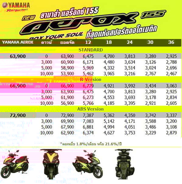 ตารางผ่อน AEROX 155 2018NEW YAMAHY AEROX ยามาฮ่า แอร็อกซ์ รุ่น Standard Version ราคา 63,900.