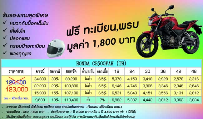 ตารางผ่อนดาวน์ รถมอเตอร์ไซค์ 2017 HONDA CB300F