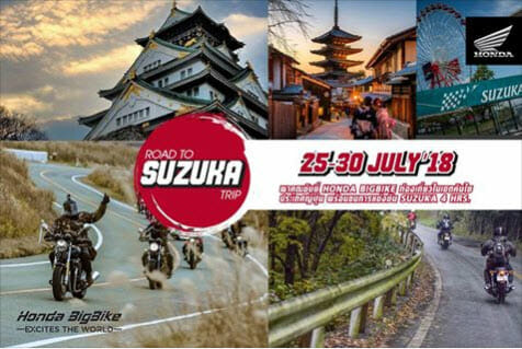 เตรียมตัวเปิดประสบการณ์สุดพิเศษที่คัดสรรมาเพื่อชาว Honda BigBike เท่านั้น กับ “Road to Suzuka Trip” กิจกรรมที่จะพาเหล่า Biker ไปสนุกกับการขับขี่บนเส้นทางสุดพิเศษไกลถึงประเทศญี่ปุ่น! จัดเต็มถึง 6 วัน 4 คืน (25-30 ก.ค. 2561) เพลิดเพลินไปกับการท่องเที่ยวในเมืองศูนย์กลางวัฒนธรรมอย่าง Osaka, Kyoto, Nara, Suzuka และ Nagoya พร้อม Highlight สำคัญสุด Exclusive ที่ไม่ควรพลาดนั่นคือ การเข้าชมการแข่งขันระดับโลกแบบติดขอบสนามอย่าง .! ถ้าคุณคือชาว Biker ตัวจริงและพร้อมลุยไปกับเรา อย่ารอช้า รีบมาสมัครกันเลย เพียง 47,900 บาท เท่านั้น!