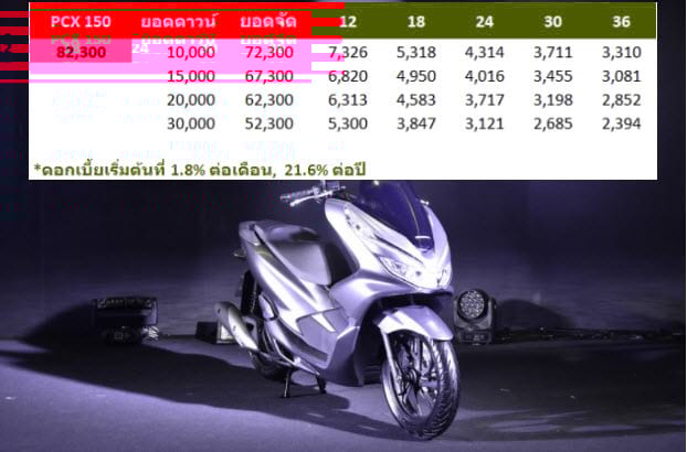 ข้อมูลราคา ตารางผ่อนดาวน์ pcx 150