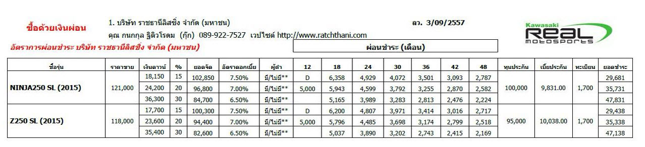 สำหรับเพื่อนชาวสองล้อ ที่กำลังมองหา kawasaki z250 sl มาใช้งาน อยากทราบข้อมูลการออกรถมอเตอร์ไซค์รุ่นนี้อยู่ว่าในการออกรถมอเตอร์ไซค์คันนี้ต้องใช้งบประมาณในการดาวน์เท่าไหร่ หากไม่ต้องการซื้อสด โดยราคาเงินสด kawasaki z250 sl คันนี้ขายอยู่ที่ราคา 118,000 บาท สำหรับเงินดาวน์เริ่มต้นแล้วแต่ศูนย์ที่ไปออก มีให้ดาวน์ตั้งแต่ 15%-30% เงินออกรถน้อยอาจจะต้องใช้คนค้ำแต่ถ้าเกิน20%ก็ไม่ต้องใช้คนค้ำ ดอกเบี้ย มอเตอร์ไซค์รุ่นนี้ตามสินเชื่อของราชธานีลิสซิ่ง อยู่ที่ 7.50% ใช้เงินออกรถที่ 17,700 บาท ค่าทะเบียน จ่ายเพิ่ม 1,700บาท