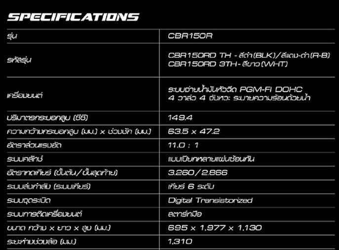 CBR 150R เครื่องยนต์ 4 จังหวะ 150 ซีซี ระบบ DOHC 4 วาล์ว มี 3 สีให้เลือก 1.สีแดง-ดำ 2.สีดำ 3.สีขาว