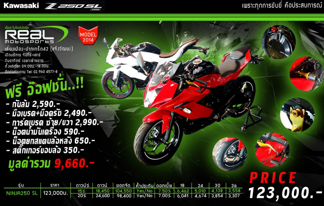 โปรโมชั่น Ninja 250 SL จัดอ๊อฟชั่นให้ยกชุด มูลค่า 9,660บาท ฟรี ” ข่าวดีครับ ” ท่านใดที่สนใจเจ้า Ninja 250 SL ไม่ควรพลาดครับงานนี้ Real Motosports (แจ้งวัฒนะ) จัดอ๊อฟชั่นให้ยกชุด มูลค่า 9,660.- ” ฟรี ” กันไปเลยครับ แบบว่าหล่อตั้งแต่ออกจากศูนย์เลย