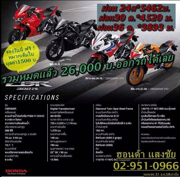 อัพเดทโปรโมชั่นผ่อนดาวน์รถมอเตอร์ไซค์ของHonda ในรุ่น Honda CBR300R จองวันนี้ฟรีหมวกกันน๊อคเต็มใบ มูลค่า 1,500 บาท โดยมีให้เลือก